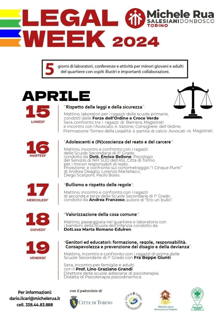 L’Oratorio Salesiano “Michele Rua” e il CineTeatro Monterosa organizzano, in collaborazione con vari enti ed istituzioni, medici e scrittori, magistrati e forze di sicurezza, una settimana di eventi, dibattiti, conferenze, workshop e laboratori, incentrati sul tema della legalità.